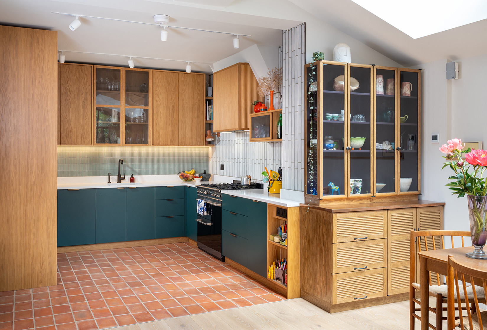 Open and glazed shelving in the dresser and wall units (including the one above the sink) allow for colourful display.