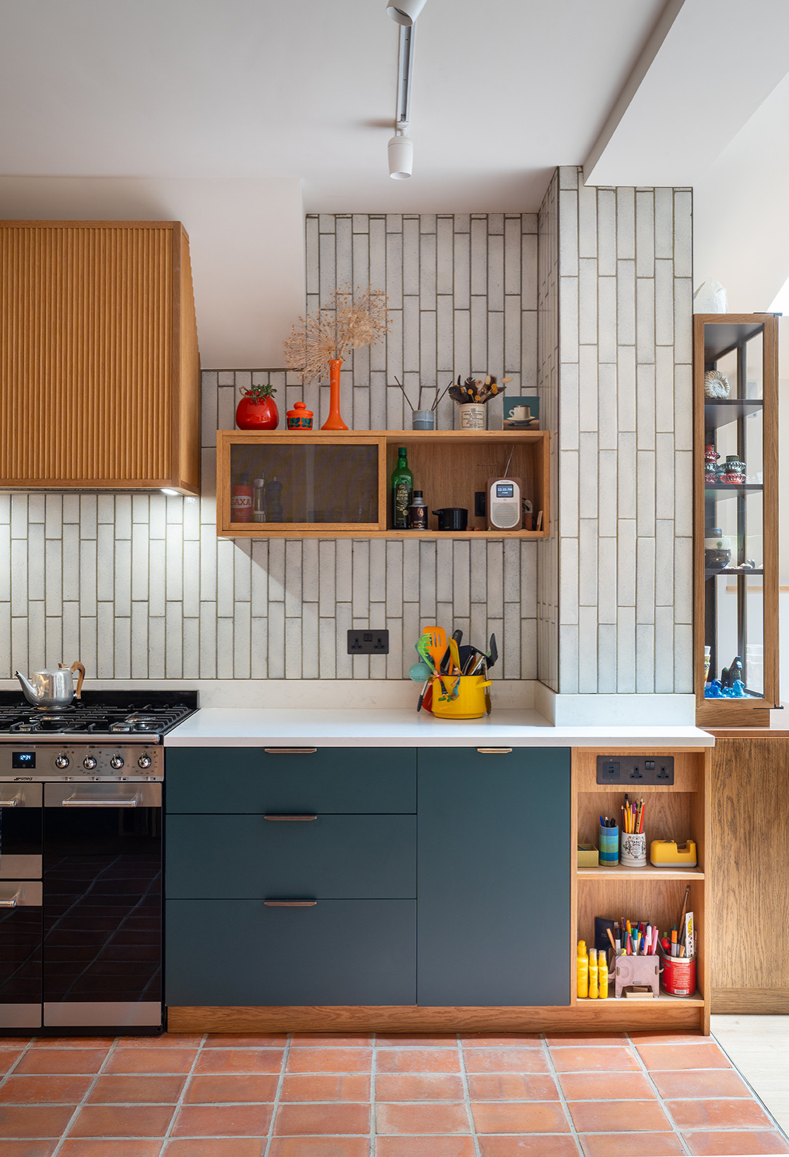 The oak kitchen was handmade by a joiner. The subtle reeded pattern seen in the tiled pillars carries through into here in the extractor cover, dresser and splashback tiles.