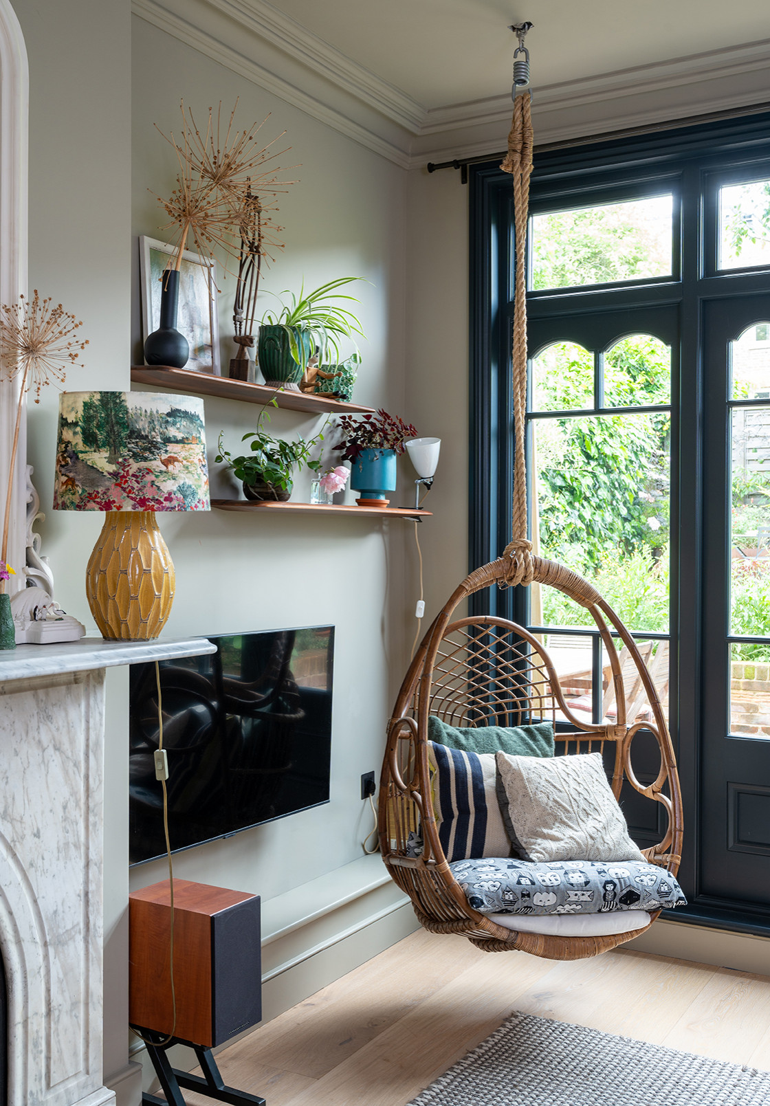 The hanging chair, surrounded by garden and house plants, makes for a serene reading spot. The owners’ ceramics and textiles bring in the colour palette.