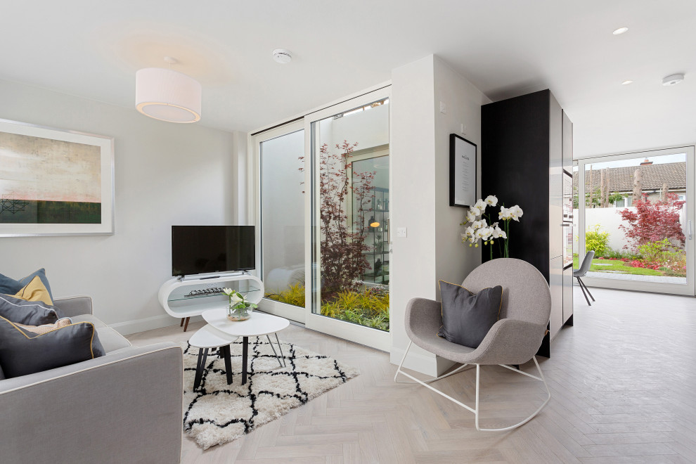 Alcove base units one L shaped to accommodate tv and floating shelving above.li