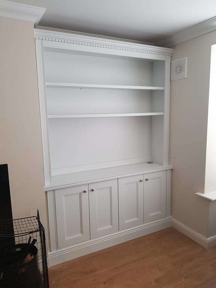 Alcove tv unit and radiator cabinet finished in pearl grey