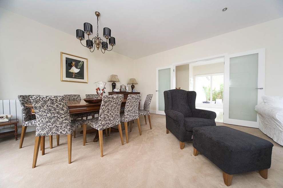 We opened up the living room with glass double doors to the hallway. We combined new pieces with the clients existing furniture. The french pleated curtains tie it all together. The cherry dining table was existing and we added the new chairs to give it a more contemporary feel.