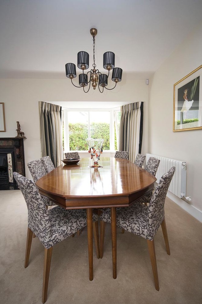 We opened up the living room with glass double doors to the hallway. We combined new pieces with the clients existing furniture. The french pleated curtains tie it all together. The cherry dining table was existing and we added the new chairs to give it a more contemporary feel.
