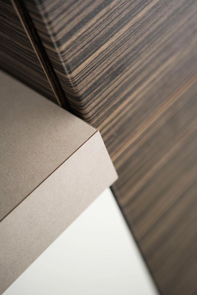 We knocked down a wall to create an plan kitchen living and dining room with glass double doors to the garden. We combined new pieces with the clients existing furniture. The kitchen is modern in matt white combined with zebra wood and a blue opaque glass to the units which ties in wit the teal dining chairs. The original marble fireplace is a nice contrast to the new modern interior.