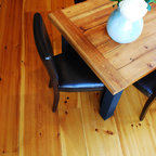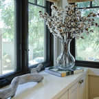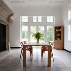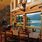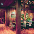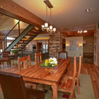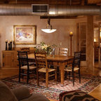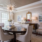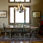 Custom iron table and a mix of traditional and modern chairs give an eclectic feel to this dining room. White ceramic antler chandelier gives a nod to the Aspen location.