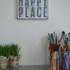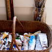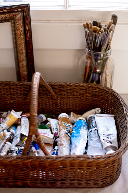 Employ handled baskets for frequently used materials. Open-top baskets with handles are easier to grab from a shelf and reach into than lidded bins, so make this your container of choice for frequently used materials. Seek out inexpensive baskets at yard sales and thrift stores, and you won’t have to worry about a little spilled paint.