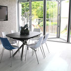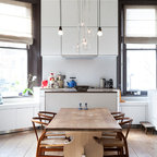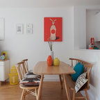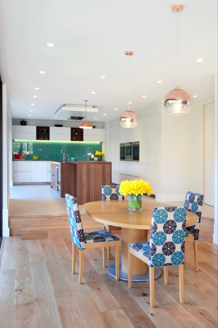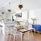 I like the idea of pendants of the same colour but different shapes for the kitchen island/ table and the dining table.