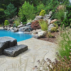 This project of ours is a pool in Massachusetts that offers plenty of surround seating and beautiful landscaping. The crystal blue water fills a fairly simply designed pool with round steps and a deep end swim out bench for relaxing in the deep end.