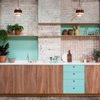 Nice use of color,; cabinets, backsplash and brick.