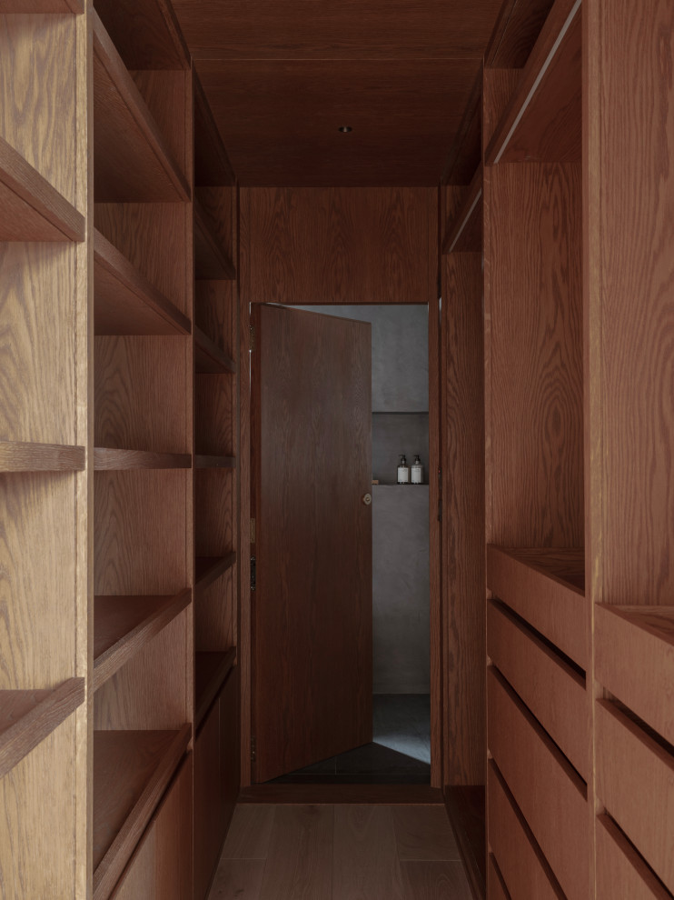 Sliding door to custom designed walk-in wardrobe . Joinery by wabi-sabi.