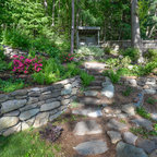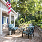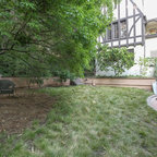 Grand ivy-covered arches mirror container-grown boxwood spheres beside the pool.