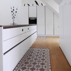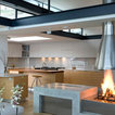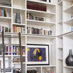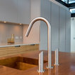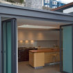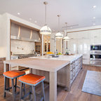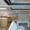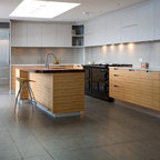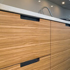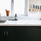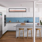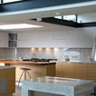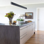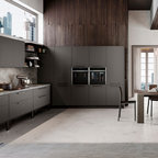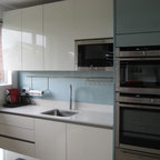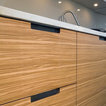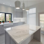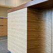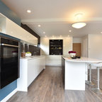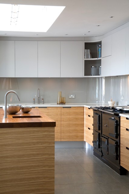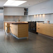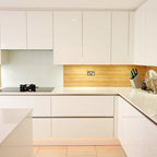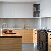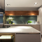 Primary materials: Painted furniture finished with sprayed PU pigmented lacquer. Full height glass splashbacks, quarter sawn olive ash veneers with bespoke recessed stainless steel handle plates. Crema Botticino quartz and solid teak worktops. Bespoke teak preparation sink.