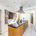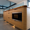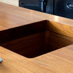 With fabulous views out to sea from the mouth of the River Dart, this bespoke kitchen posed some exciting challenges for our team: the new build house had to have all its materials delivered by barge because of difficult access from above. With its proximity to the sea and our clients’ passion for sailing, the island was inspired by a yacht’s galley. The solid teak worktop includes a wooden preparation sink and the glass splashback was custom made to follow the curve of the wall.