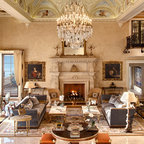The formal living room showcases a breathtaking 18th century antique French limestone fireplace with a trumeaux over-mantle.