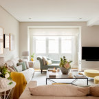 “En la zona de vestidor, una alfombra de pelo largo y cortinas que bailan a ras de suelo acaban de darle forma al conjunto”, cuenta la profesional sobre este dormitorio bonito y práctico.