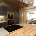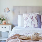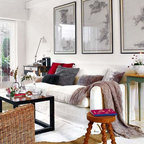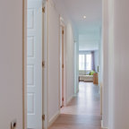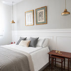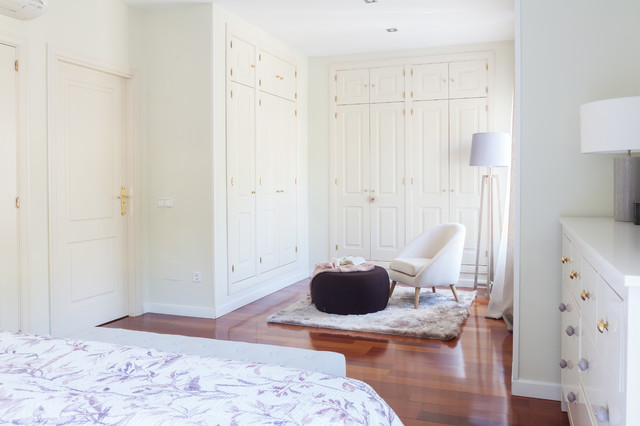 Aquí vemos una vista de la zona de vestidor desde la cama. Los armarios en L rodean un puf y butaca para leer o donde colocar la ropa. La alfombra y la lámpara de pie terminan de convertir la zona de vestidor en un espacio funcional y confortable.