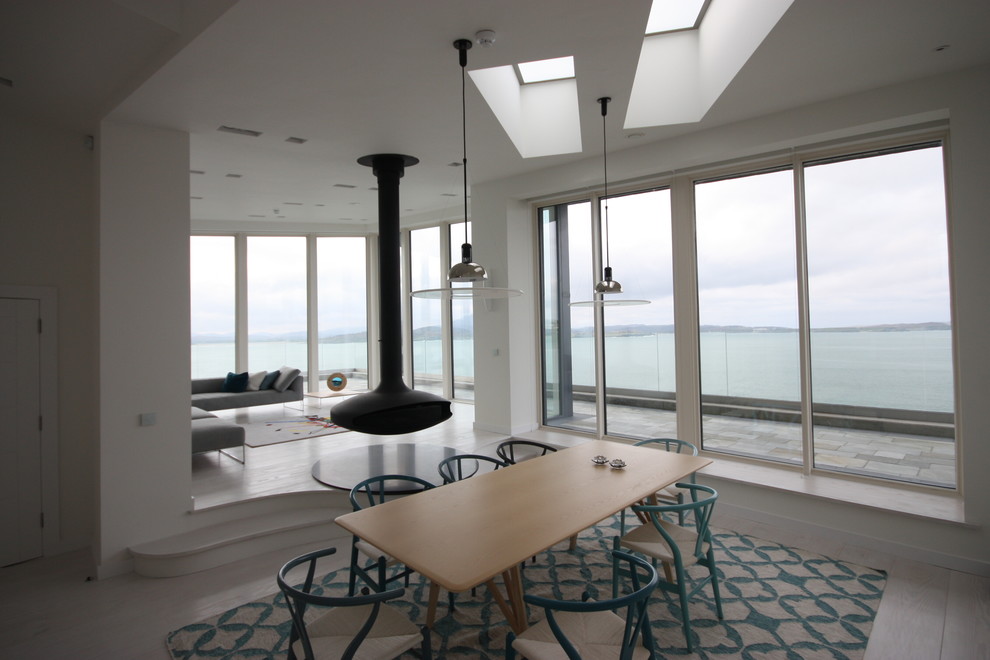 View from dining room towards living area. Gyrofocus fireplace separates the spaces