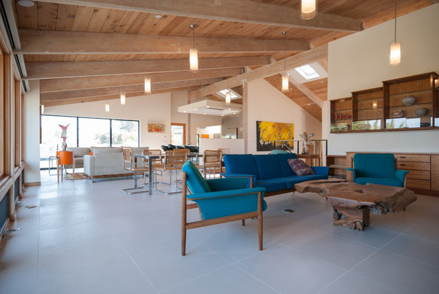 This project got its start when a proud homeowner built his residence a number of decades back on a beautiful site in Solana Beach. The new design proposed a complete reconfiguration of the interior layout and a new gallery walkway. These changes would tie together the existing house and detached garage. Simple and well executed framing made this work relatively simple, keeping the existing exterior walls and roof in place. New interior and exterior finishes were applied throughout the house. In addition to reusing most of the existing structure, sustainable features include abundant natural light and ventilation, radiant heating, solar hot water and a PV system.