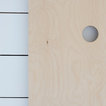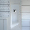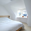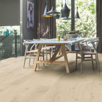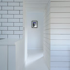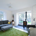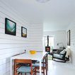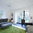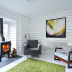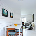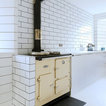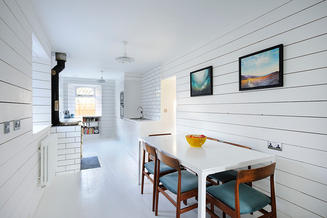 Kitchen dining room in Scandinavian inspired cottage renovation in Aberdeenshire, Scotland. White painted timber wall linings and floors. Mid century dining chairs paired with traditional range cooker stove, and white tiles. Copyright Nigel Rigden