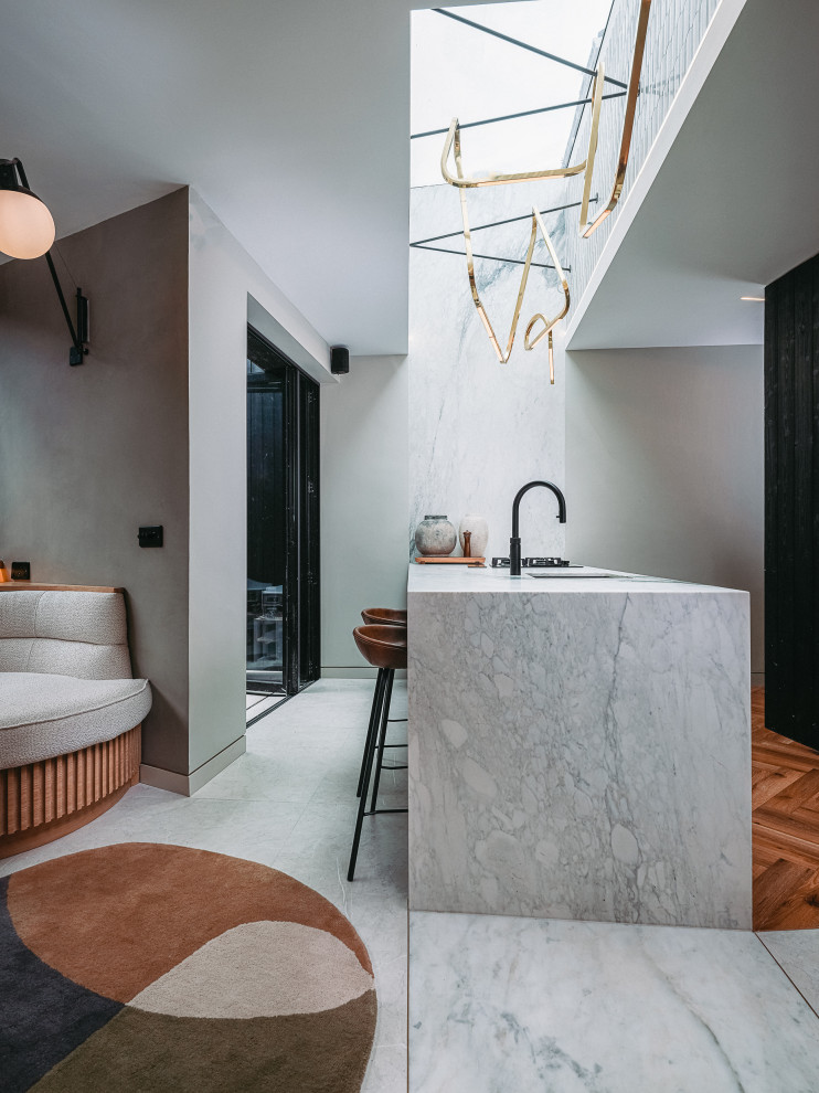 The new kitchen extending into the garden to create a multi-space set up with the island as a centrepiece and a very large pantry hidden behind charred timber wall that holds everything else. The rooflight is extended up nearly 2 meters through the ceiling creating a void of light, and inside it we designed and a one of a kind brass light that twists and bends on itself taking up the void while also creating a very even working light for the counter itself.