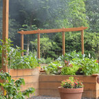 3. Contained kitchen garden in Newton, Massachusetts. Measuring just 12 by 13 feet, this veggie garden is a great size for having plenty of produce without too much maintenance. The owners circled the veggie garden with a 4-foot-tall fence made of hardware cloth stretched between cedar posts, and they planted the raised beds with tomatoes, broccoli, beans, herbs and flowers.