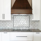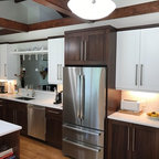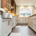This remodel used a similar footprint but gained some great new use of the space. An overhang to the peninsula for seating, more functional cabinetry with drawer banks and trash pullout, and a custom coffee bar with a vintage window were the big gains in this space. Hardwoods throughout the kitchen and living room meet black and white hex tile in the back hall and powder bath.