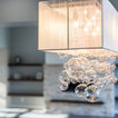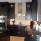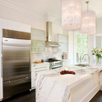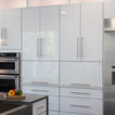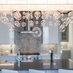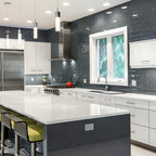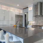 Glossy white cabinets, silver/sparkling backsplash tiles with dark solid color countertop.