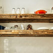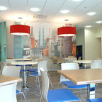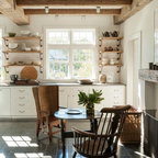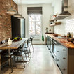 brick, table and chairs, like that everything except a tall cabinet is on one side of the room.