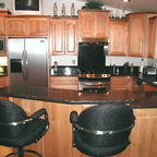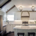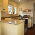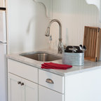 This cozy and functional kitchen is perfect for a renovated posta nd beam barn. The Wood-Mode and Brookhaven cabinetry in a barn red paint with rub off and distressed cherry add to the loosely fitted look.