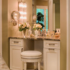 Light and bright. Like the floors, white cabinets, clear drawer pulls and grey counter tops. Make silver trim on mirrors and light.