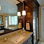 We utilized a Moroccan inspired mirror to accentuate and play with the unusual slanted roof line. By adding clean lines and ample drawers for storage, we were able to transform this outdated bathroom into a true modern master retreat.