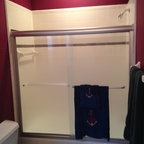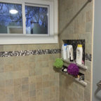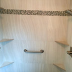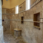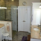 We utilized a Moroccan inspired mirror to accentuate and play with the unusual slanted roof line. By adding clean lines and ample drawers for storage, we were able to transform this outdated bathroom into a true modern master retreat.