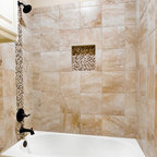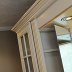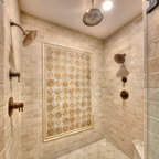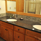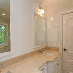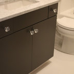 We utilized a Moroccan inspired mirror to accentuate and play with the unusual slanted roof line. By adding clean lines and ample drawers for storage, we were able to transform this outdated bathroom into a true modern master retreat.