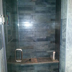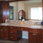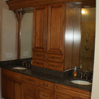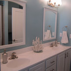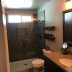 We utilized a Moroccan inspired mirror to accentuate and play with the unusual slanted roof line. By adding clean lines and ample drawers for storage, we were able to transform this outdated bathroom into a true modern master retreat.