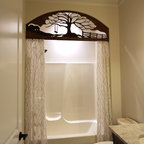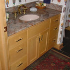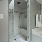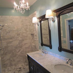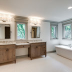 We utilized a Moroccan inspired mirror to accentuate and play with the unusual slanted roof line. By adding clean lines and ample drawers for storage, we were able to transform this outdated bathroom into a true modern master retreat.