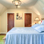Interesting placement of bed against windows in attic bedroom, with closet wall opposite.