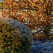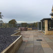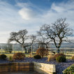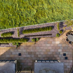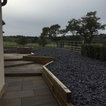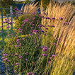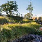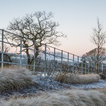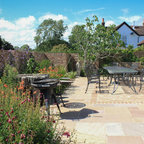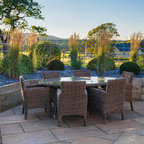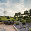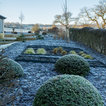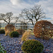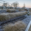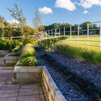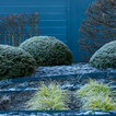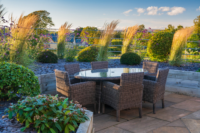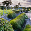 Modern planting design. Topiary yew and hornbeam used to add form and pattern whilst blending with rural views from patio. Calamagrostis KF withstands exposed site.