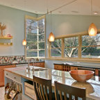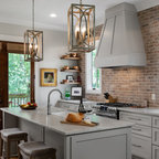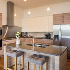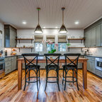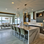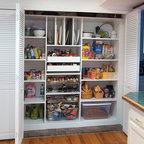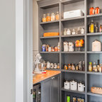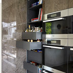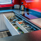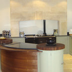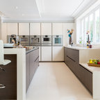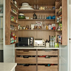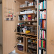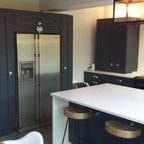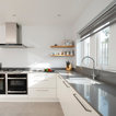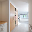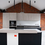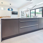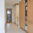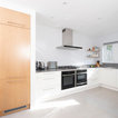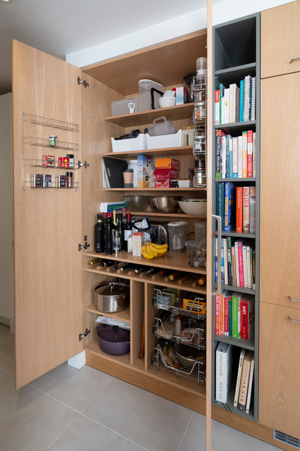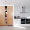 The new owners of this traditional semi in Cardiff wanted to create a light, bright sleek kitchen that was contemporary but not stark. Most of thec upboard doors were painted in a soft shade of chalky white whilst the tall larder and fridge were in oak to add warmth and richness to the room. Adding in an open shelving unit in a dark grey to pick up the colour of the quartz worktop brought the separate elements of the room together. The original galley kitchen had been extended to open up the space so to counteract the corridor effect this created we divided the area into kitchen and hallway by making a tall cloaks cupboard and low level area for keys and telephones in white to tie in with the kitchen but create a divide between the two separate areas..