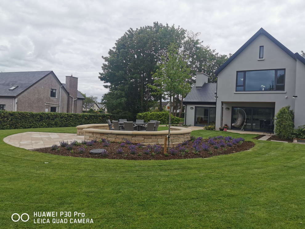 Outdoor dining space away from house to maximise sunlight. raised wall to allow extra seating capacity. extended area for lounge / sun chairs.