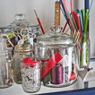 Organize small items in lidded glass jars. Spice jars, jam jars, apothecary jars and Mason jars make excellent and budget-friendly containers for all manner of small crafting supplies, such as washi tape and buttons. Annoying-to-clean-up items like sequins and beads should always go in lidded containers since an accidental bump can send them flying far and wide.