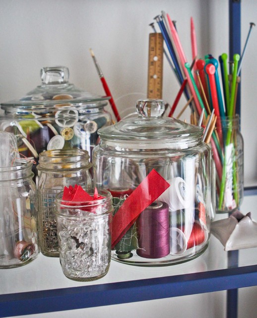 Organise small items in lidded glass jars Spice jars, jam jars, apothecary jars and Mason jars make excellent and budget-friendly containers for all manner of small crafting supplies, such as washi tape and buttons. Annoying-to-clean-up items, such as sequins and beads, should always go in lidded containers, since an accidental bump can send them flying far and wide.