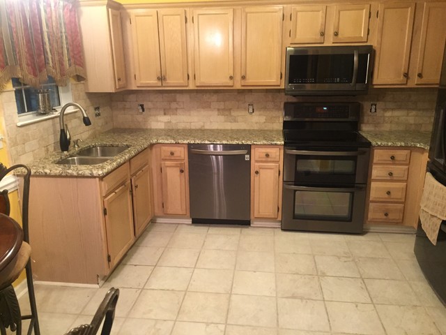 New Tumbled stone 3x6 backsplash with pencil rail
