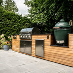 Using an L-shape configuration set within a custom designed permanent timber gazebo, this outdoor kitchen is cleverly zoned to include all of the key spaces required in an indoor kitchen for food prep, grilling and clearing away. On the right-hand side of the kitchen is the cooking run featuring the mighty 107cm Wolf outdoor gas grill. Already internationally established as an industrial heavyweight in the luxury range cooker market, Wolf have taken outdoor cooking to the next level with this behemoth of a barbeque. Designed and built to stand the test of time and exponentially more accurate than a standard barbeque, the Wolf outdoor gas grill also comes with a sear zone and infrared rotisserie spit as standard.