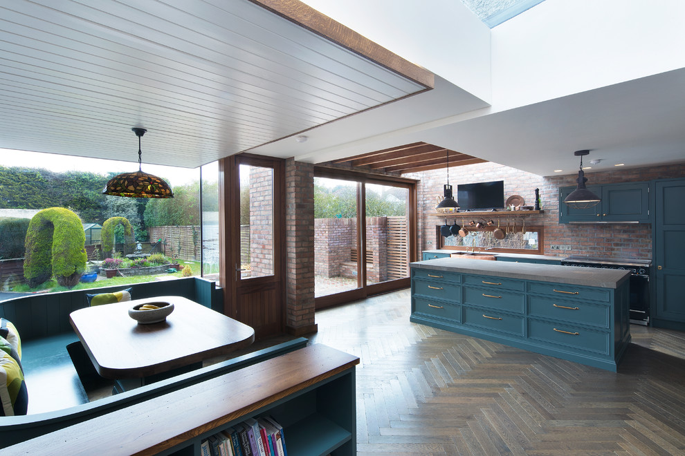 The clients brief for this large 1930s house was to demolish several internal walls to covert a narrow āLā shaped kitchen into a large open family space. Key client desires included a nook capable of seating the whole family and a functional āindustrialā style.