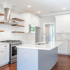 open shelving allows for a larger expanse of the 4-by-12-inch Carrara marble tiles and transformed the wall into a stunning focal point that grabs your attention as soon as you walk in the room. “It was important to have that texture of the marble here. A medium-gray grout with used which would be easier to keep clean