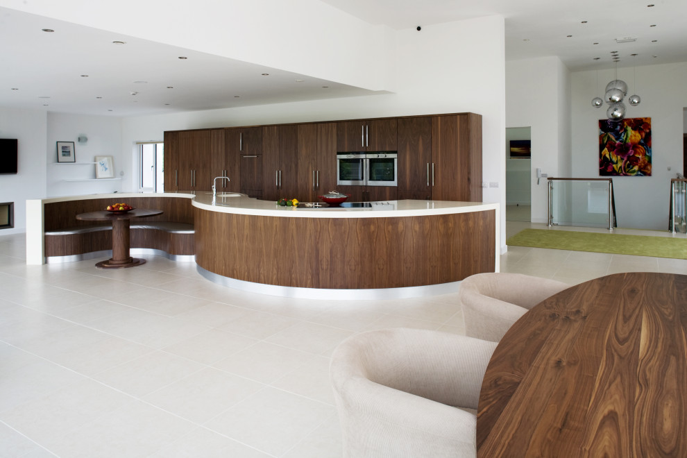 A massive bank of tall units hosts various integrated appliances, with pantry items stocked behind tall pocket-doors. The stunning island unit literally sweeps through the kitchen space and effortlessly serves as an abundance of work-top space for cooking and cleaning, including a comfortable seating area with solid walnut table cleverly worked into this design.
