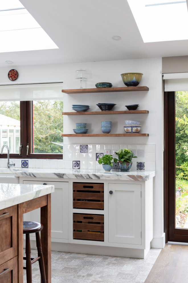 This two-tone in-frame shaker design pairs fresh white cabinetry with a central island and accents in rich dark oak. A playful mix of oak knobs, grey-painted knobs, and satin nickel handles adds subtle visual interest, while extra-thick marble worktops and a tiled backsplash with patterned insets bring depth, texture, and a touch of vintage artistry.