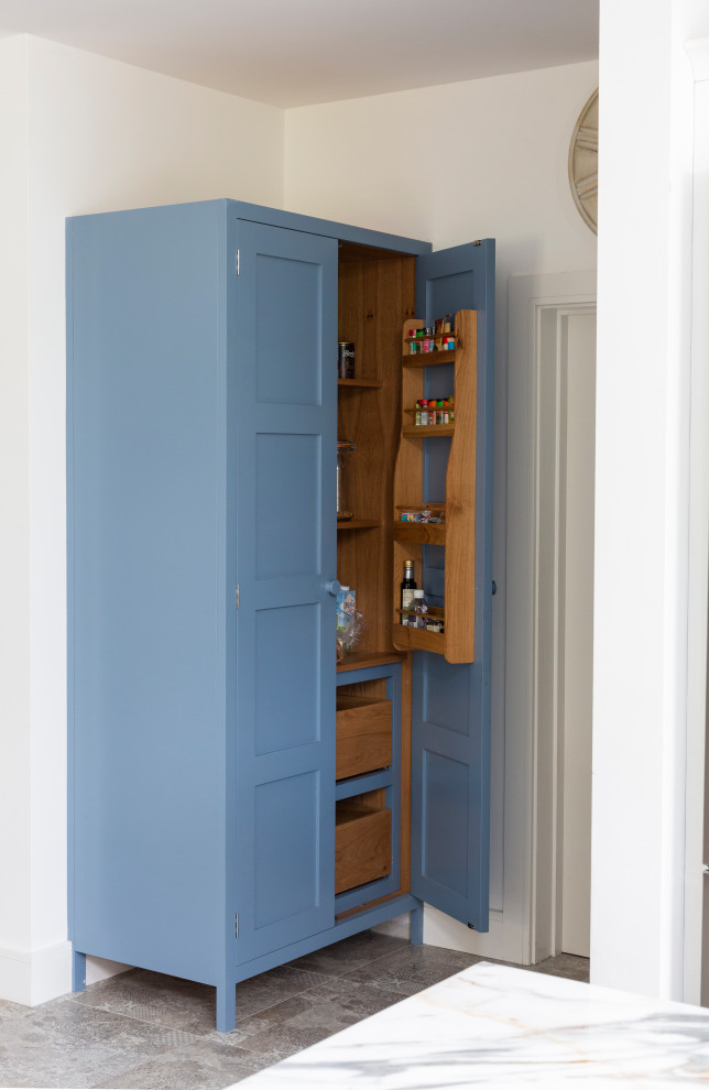 The kitchen is equipped with a large stainless-steel American fridge-freezer, a black-and-white Rangemaster cooker framed within a contemporary hood, a classic porcelain Belfast sink, and a separate freestanding pantry unit painted in sky blue.
