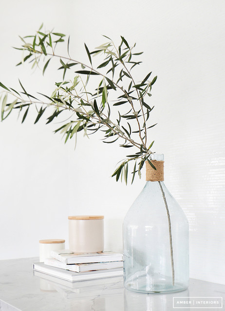 6. Olive. These Mediterranean branches have a lovely shape and beautiful silver-green hue. Olive branches are available year-round from florists — or simply snip some outdoors if you or someone you know has a tree. Style: Relaxed, farmhouse, elegant, natural, simple. How to use: Cut one or more olive branches and place them in a large glass vessel, such as a jug or demijohn.
