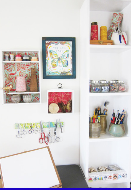 Attach scissors to a magnetic rail A magnetic knife rail isn’t just for the kitchen – mount one above your craft table to keep scissors handy. It also holds magnetic spice containers filled with tiny items like seed beads or glitter.